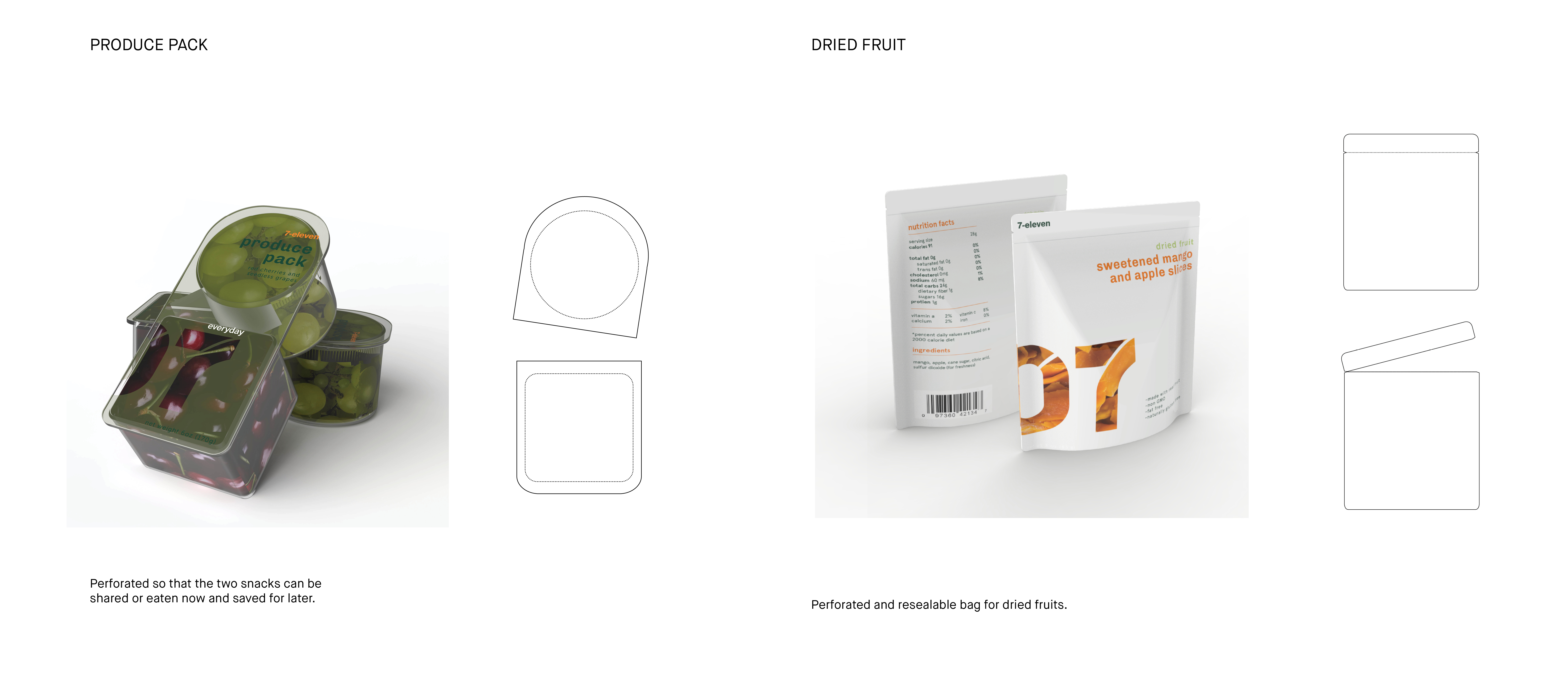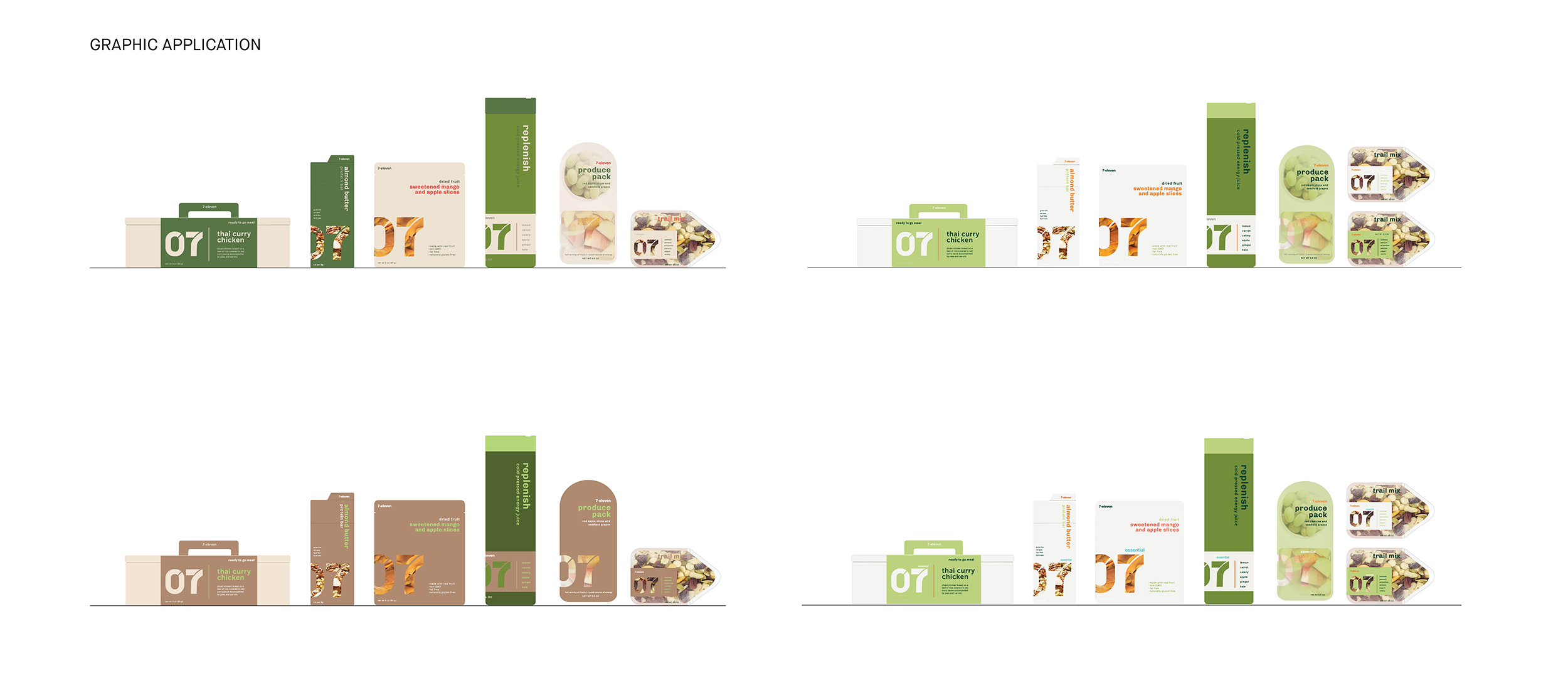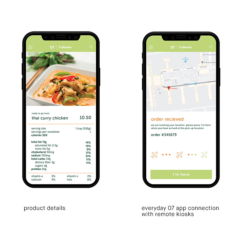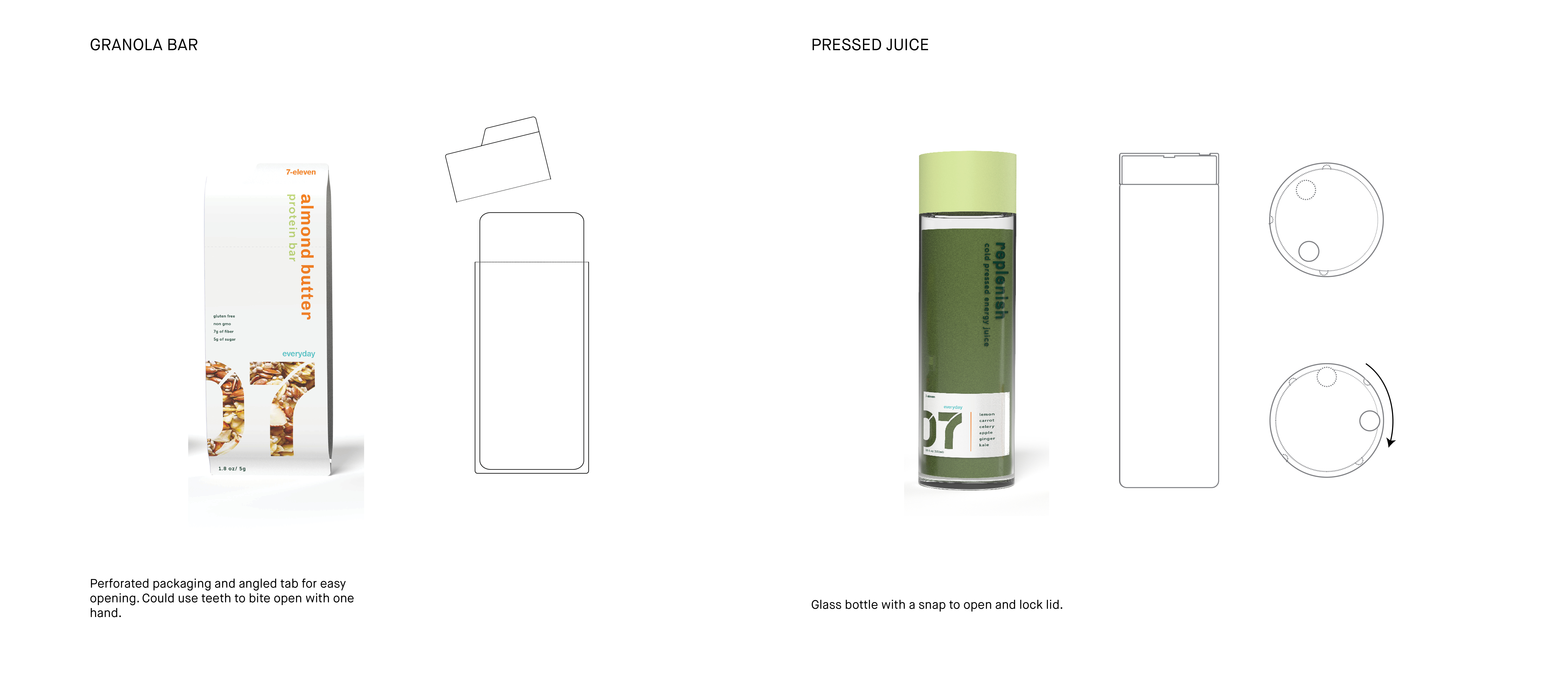 Inspired by the target audience of young professionals, the line speaks to a health conscious person and is created with ease of usage both with location and packaging in mind. Everyday 07 is able to provide accessibility to fresh and healthy food for those who have a busy lifestyle or neighborhoods where it is a food desert. The visual identity speaks to the transparency of natural and healthy ingredients that goes into Everyday 07 products. This is shown in through product design, consumer packaging, digital kiosk, and mobile extension.
